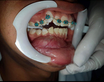 Al examen clínico facial y maxilar (figura 1), se apreció piel de color normal, sin alteraciones. En la inspección de la región mandibular derecha canina, se observó un aumento de volumen duro, elástico, no móvil, no doloroso a la palpación y con bordes bien definidos. En el examen intraoral, se evidenció ligera movilidad de las piezas dentarias, apiñamiento en el sector anteroinferior mandibular y ausencia de la pieza 4.3. A nivel del fondo del surco vestibular, se apreció mucosa de color normal y aumento de volumen que producía un borramiento del mismo, no doloroso a la palpación superficial ni profunda.
