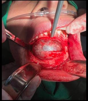 Se procedió a realizar la enucleación quirúrgica (figura 3), observándose un aumento de volumen de 4 cm que produjo expansión de la cortical externa, la cual se encontraba muy delgada y se desprendió fácilmente. Se eliminó la lesión en su totalidad, encontrándose con la membrana quística, la cual fue liberada completamente de la estructura ósea previa aspiración de líquido para facilitar el decolamiento. En la región basal mandibular, se apreció la pieza dentaria 4.3 en íntima relación con la lesión. Al inspeccionar las piezas dentarias, se observó reabsorción del tercio medio radicular en las piezas anteriores y premolares, con presencia de movilidad. Se realizó la enucleación total de la lesión, lavado y curetaje del sitio quirúrgico, quedando un defecto óseo. Se suturó por planos, primero a nivel muscular y luego a nivel mucoso. La lesión fue enviada en su totalidad para estudio histopatológico.