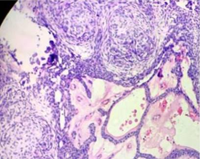 El reporte histopatológico, realizado por la patóloga especialista, describió macroscópicamente una lesión quística con diente retenido de 2,8 x 2 x 2 cm, cápsula íntegra y líquido sanguinolento al corte, con un área sólida exofítica de aproximadamente 1 cm en la pared quística. Microscópicamente, se observó una formación quística revestida de epitelio estratificado plano, con nidos sólidos de células columnares y fusiformes de epitelio odontogénico, presencia de pseudorrosetas y pseudoductos, y material amorfo eosinófilo, en ocasiones en forma de gotas, centrando algunas de las estructuras descritas. La cápsula era fibrosa y gruesa, con presencia de un nido de lesión intramural. Se evidenció cortical ósea libre de lesión. El diagnóstico fue tumor odontogénico adenomatoide uniquístico (figura 4), variante folicular, con exéresis completa.