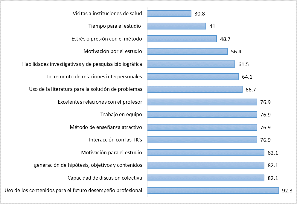 En la figura 1 se muestra en orden ascendente los beneficios del método PBL con resultados significativos, percibidos por los estudiantes expuestos a la estrategia. En este sentido, el uso del contenido para el futuro desempeño profesional; el desarrollo de la capacidad de discusión colectiva; el desarrollo de habilidades para generar hipótesis, objetivos y sistema de contenidos; la motivación por el estudio y la interacción con las TICs fueron los cinco aspectos más relevantes
