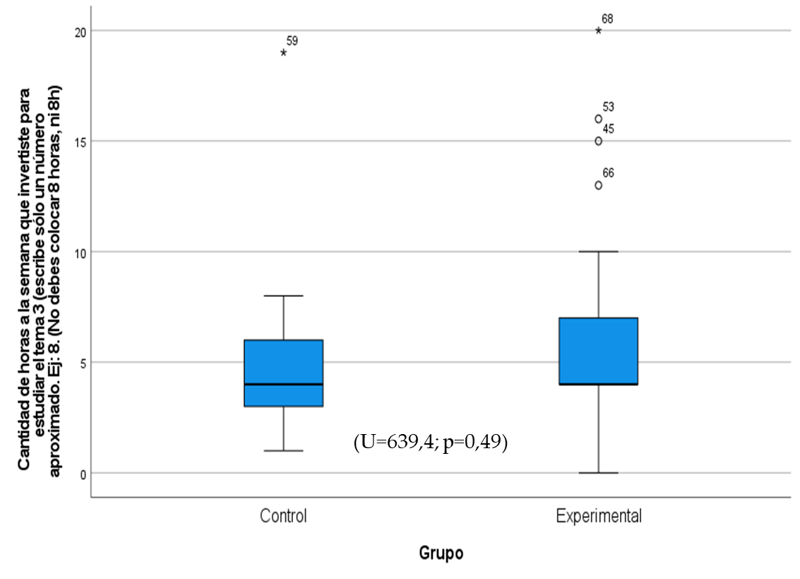 Si se tiene en cuenta el número de horas promedio por semanas invertidas para el estudio de la asignatura por ambos métodos, los estudiantes del grupo control invirtieron un promedio de 4,81 horas semanales para el estudio de la asignatura con un IC95% (3,81; 5,81) y SD de 2,89. Resultados similares a los obtenidos por los estudiantes del grupo experimental de 5,92 horas semanales como promedio, IC95% (4,53; 7,31) y SD de 4,44. No existen diferencias significativas entre ambos grupos (U=639,4; p=0,49). (figura 2)