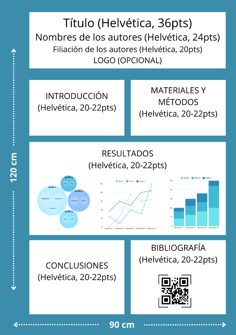 Respecto del tamaño y dimensiones, éstas varían en dependencia de las políticas de los eventos científicos en los que se pretende presentar un póster científico. Actualmente, se realizan presentaciones en pantallas digitales que facilitan la disertación y defensa de los mismos. Sin embargo, una medida recomendable sería de 120 cm de alto por 90 cm de ancho. Esta medida es aplicable, tanto si el póster se presenta de forma vertical u horizontal.(13,26,28,30)