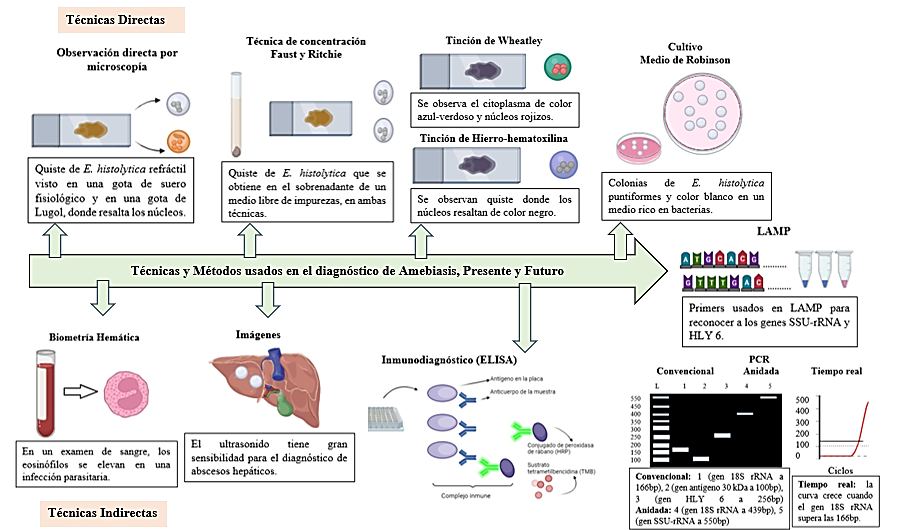 La amebiasis es una infección intestinal prevalente en todo el mundo, siendo la población de países subdesarrollados y tropicales los más afectados. La enfermedad es provocada por el género Entamoeba, se considera a Entamoeba histolytica la única especie patógena para el ser humano, afectando el intestino, pulmón, cerebro e hígado con la formación de abscesos. Se consideran que los datos de prevalencia e incidencia de amebiasis están sobreestimados, debido a que tradicionalmente la epidemiología de la enfermedad se ha estudiado mediante observación directa por microscopía, técnica que no facilita diferenciar a E. histolytica de otras amebas morfológicamente similares y no patógenas. Para identificar la tasa real de infección de amebiasis se han implementado técnicas y métodos que elevan moderadamente la especificidad diagnóstica de amebiasis, como las técnicas de concentración (Faust y Ritchie), tinciones, cultivos y exámenes de sangre, estos métodos no ha logrado resolver esta problemática de salud pública. La llegada de la tecnología los laboratorios han logrado implementar técnicas que identifiquen a microorganismos a nivel molecular utilizando técnicas como: Polymerase chain recation (PCR) o Loop-mediated isothermal amplification (LAMP), cuya tasa de especificidad están cerca al 100%, las cuales son consideradas como técnicas novedosas cuyo objetivo es actualizar el proceso diagnóstico de amebiasis.
