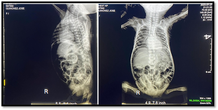 Evolución: prematuro de 28 semanas de gestación, con distrés respiratorio y pesos y no de acordes a su edad, es ingresado a neonatología donde se realizan exámenes de laboratorio que refieren anemia mas niveles bajos de oxígeno, se complemente con trasfusión mas CPAP, paciente responde favorablemente se realiza Rx de Abdomen donde evidencia perforación intestinal, se deriva a cirugía pediátrica que evidencia enterocolitis necrotizante.