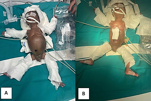 A la exploración física sus signos vitales fueron: Tensión arterial: 82/49 mmhg, Tensión arterial media: 54; frecuencia cardiaca: 121 latidos por minuto; frecuencia respiratoria de 40 respiraciones por minuto; temperatura de 36,8°C; Saturación de oxígeno 99 % con FiO2 de 25 %. Peso: 745 gr, talla: 30,5 cm, perímetro abdominal: 23 cm, perímetro cefálico: 24,5 cm.
