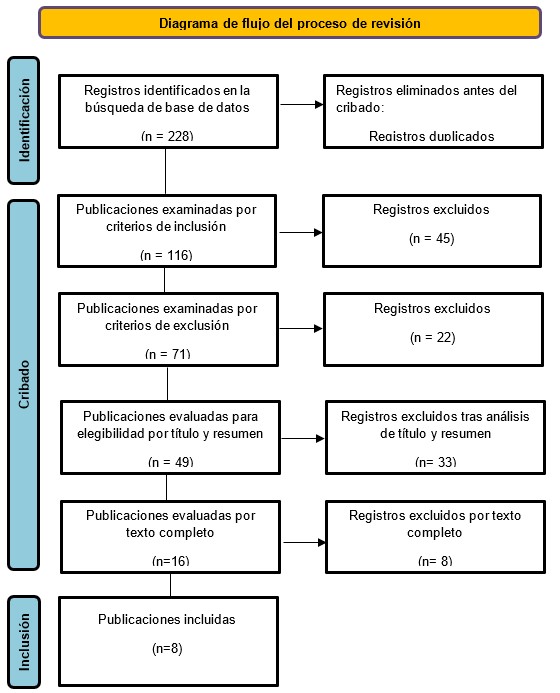 Tras la búsqueda en las bases de datos SCOPUS, PUBMED Y EBSCO se obtuvieron 228 artículos. El proceso de selección incluyó 8 artículos que cumplieron con los criterios esperados, el cual se detalla en la figura 1.