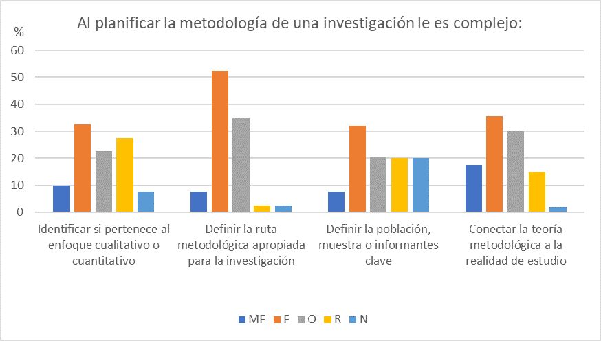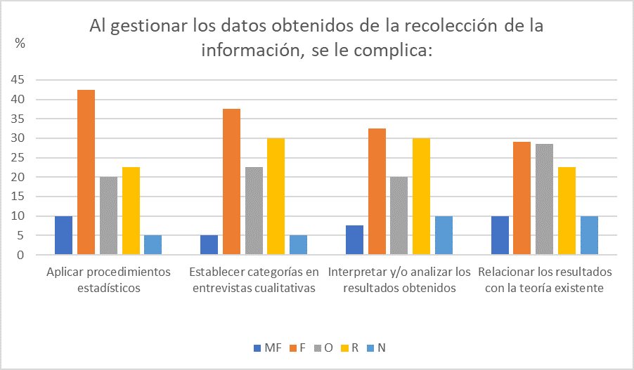 En el caso de estudios con ruta metodológica cuantitativa, los estudiantes indicaron que al 52,5 % se le dificulta aplicar procedimientos estadísticos, 42,5 % desconoce cómo establecer categorías en discursos obtenidos en estudios cualitativos, al 40 % le es difícil interpretar o analizar la información sistematizada, 39 % considera complicado vincular los datos con la teoría existente en el campo de conocimiento relativo al estudio.