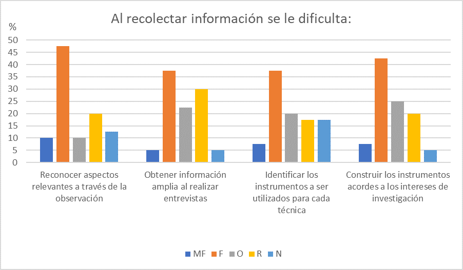 A razón de ello, se puedo constatar que el 57,5 % no discrimina los aspectos relevantes al realizar observación científica, el 42,5 % obtiene respuestas concretas que no permiten la comprensión del objeto de estudio al realizar entrevistas a profundidad, 45 % desconoce la congruencia de la aplicación de instrumentos con la técnica seleccionada y 50 % considera que al construir instrumentos de recolección de información aborda aspectos que se deslindan de los objetivos de investigación.