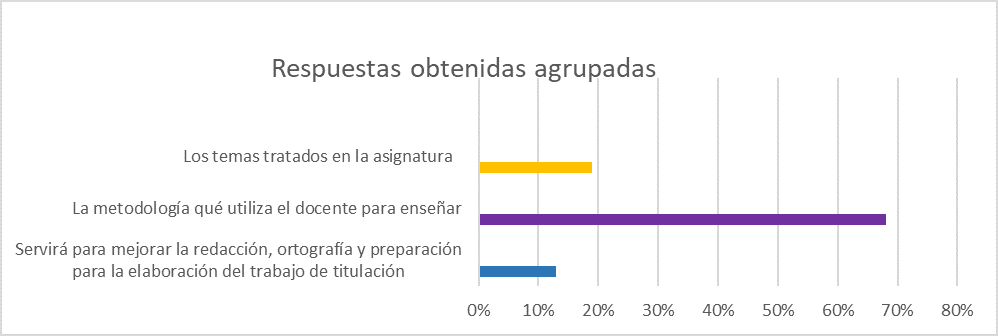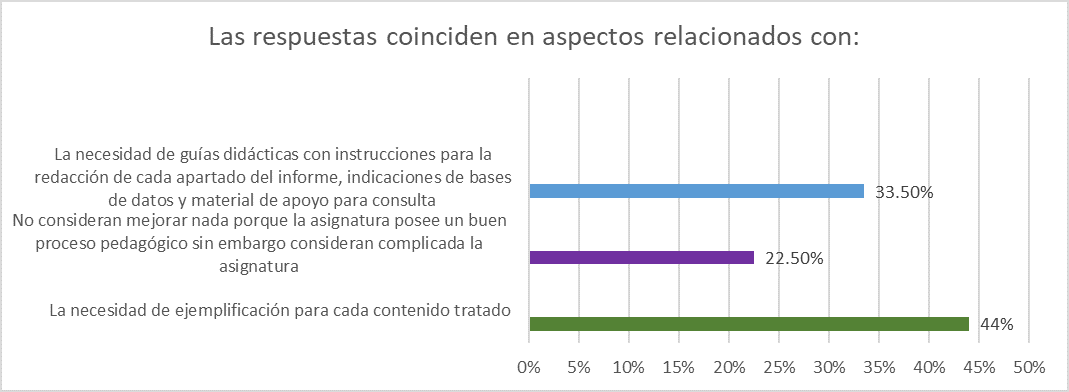 Los 325 estudiantes encuestados proveyeron respuestas diversas en las que manifestaron de modo indirecto que la asignatura en sí misma es complicada, sin embargo, el 22,50 % lo expresaron de manera explícita. Aunado a ello, el 44 % considera que es necesario fortalecer la explicación del docente con ejemplificación para clarificar el contenido abordado y el 33,50 % considera que es necesario desarrollar material didáctico con instrucciones precisas sobre la redacción de cada apartado del informe de investigación, material didáctico sobre el uso de bases de datos y material de apoyo para la consulta.