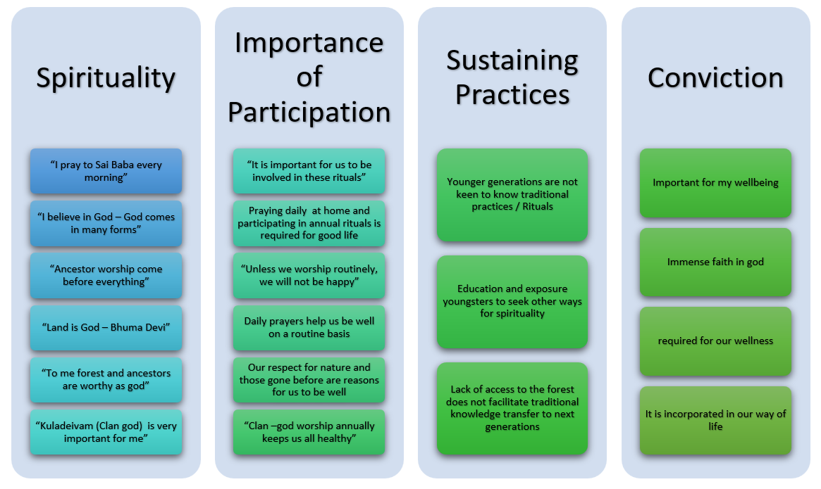 Theme 3: Sustaining Practice: being intricately involved in Tribal wellness, transfer of knowledge about tribal culture and spirituality becomes imperative. The women in their responses had these observations about sustaining this practice: lack of access to the forest has impeded transfer of traditional rituals since the Irulas for generations have been tying their spiritual and belief in God to their land and forests. Furthermore, education and exposure has allowed younger people to explore other ways of worship. Also, being in school and college does not allow the younger people to be engaged in these rituals and hence there is less interest further compounded by the lack of access to the forest where many of these rituals happen traditionally.