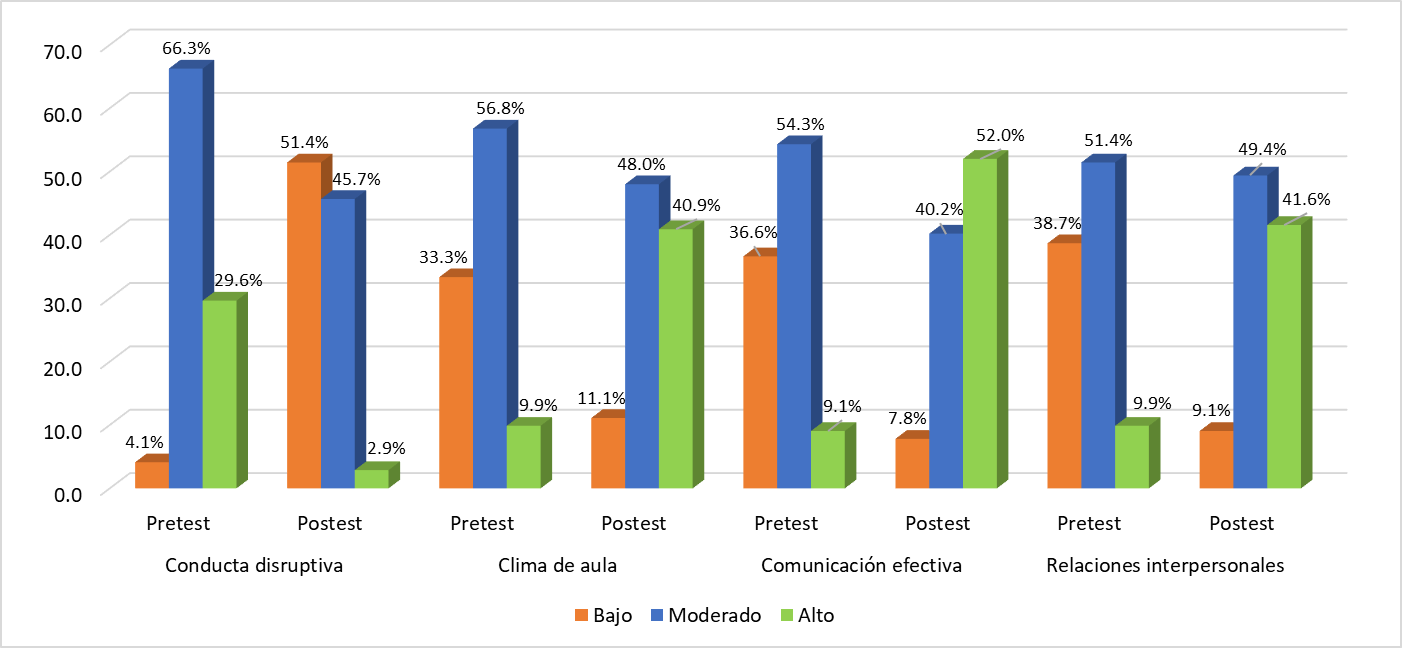 En la figura 1 se representan las distribuciones porcentuales antes y después de implementar el programa psicoeducativo. Antes de la intervención, el nivel predominante de la variable conducta disruptiva fue moderado. Sin embargo, tras la aplicación del programa, este nivel se redujo, siendo predominante el nivel bajo. En cuanto a las dimensiones de clima de aula, comunicación efectiva y relaciones interpersonales, durante el pretest, el nivel predominante también fue moderado. No obstante, en el postest, aunque el nivel predominante de las dimensiones clima de aula y relaciones interpersonales se mantuvo en moderado, se observaron mejoras significativas en la percepción. Además, la dimensión comunicación efectiva fue valorada en un nivel alto.