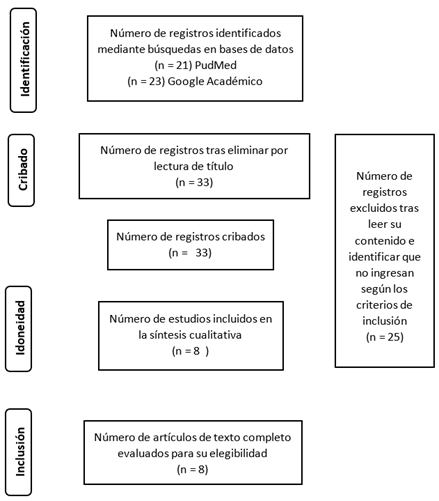En el mismo mes de 2023, se realizó una nueva búsqueda en PubMed y Google Académico, limitando los resultados a publicaciones desde 2019. Esto generó 21 resultados en PubMed y 23 en Google Académico. Se definieron criterios de inclusión y exclusión, y tras una evaluación inicial basada en los títulos, 33 artículos fueron considerados adecuados. Después de revisar los resúmenes, se descartaron 25 por no centrarse específicamente en endodoncia. Finalmente, 8 artículos cumplieron con los criterios de inclusión y fueron seleccionados para la revisión sistemática, como se muestra en la figura 1.