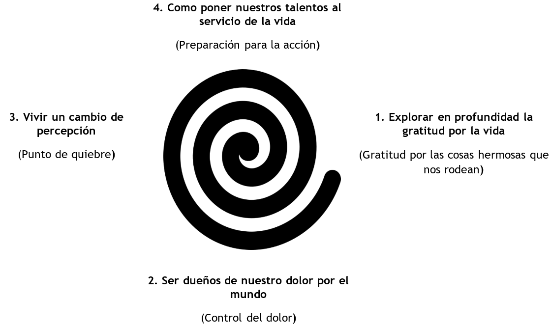 Para la implementación de las sesiones para el grupo intervención, se utilizó el Modelo de Ecología Profunda,(3,12,16) donde expresa que todos son seres biológicos e integralmente conectados con el universo, además el individuo tiene una “ecopsiquis” y en la sociedad moderna la mayoría de estos procesos de construcción de pensamiento ecológico han sido trastornados y suplantados por dinámicas que sustituyen y destruyen la empatía sensorial, tanto con el cuerpo como el entorno. Se expone como ecología profunda (Figura 1), donde propone cuatro fases: Explorar en profundidad la gratitud por la vida (gratitud, cosas hermosas de lo que nos rodea), ser dueño de nuestro dolor por el mundo (control del dolor), Vivir un cambio de percepción (punto de quiebre), como poner nuestros talentos al servicio de la vida (preparándose para la acción), además, se retomaron los estudios que probaron la eficacia del uso del modelo psicoecológico.(3,12,17)