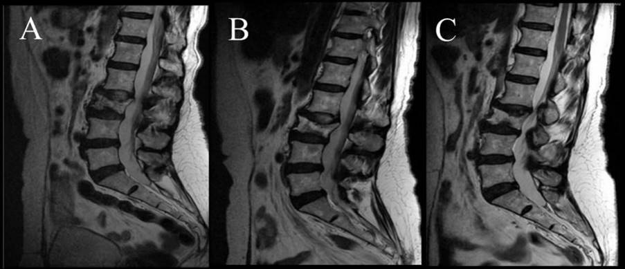Figura 1. Imágenes de RM en vista sagital muestran aumento visual en la densidad ósea en la L3 de paciente con linfoma no Hodgkin metastásico. Fractura patológica en la vértebra L3, 2020 (A), y la recuperación de la misma en 2021 (B) y 2022 (C).