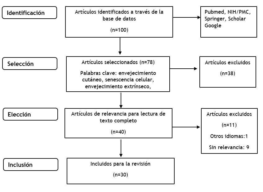 Se realizo una búsqueda de evidencia científica en el idioma inglés publicada en bases de datos como: Pubmed, NIH/PMC, Springer, Scholar Google desde el 01 de enero de 2019 hasta el 11 de noviembre del 2023 con las palabras clave: envejecimiento cutáneo, senescencia celular, envejecimiento extrínseco y envejecimiento intrínseco; este trabajo es una revisión bibliográfica de tipo descriptiva. La literatura seleccionada es redactada en el idioma inglés y español.