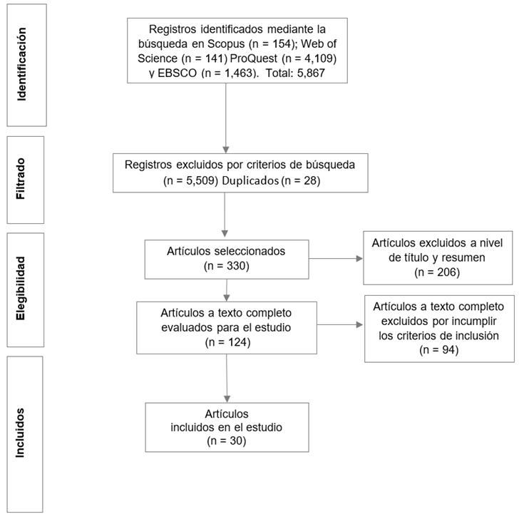 Como se puede observar en la figura 1, se identificaron 5,867 artículos de las bases de datos seleccionadas para el estudio, encontrándose 154 de la base de datos Scopus, 141 de Web of Science, 4,109 de ProQuest y 1,463 de EBSCO. Del total de artículos identificados se excluyeron por criterios de búsqueda 5509, siendo eliminados 28 registros por duplicidad. Fueron seleccionadas 330 publicaciones y excluidas a nivel de título y resumen 206; se eligieron 124 artículos a texto completo para ser evaluados, excluyéndose 94 por no cumplir con los criterios de inclusión y exclusión; finalmente, se incluyeron 30 artículos de enfoque cualitativo, cuantitativo y mixto para la revisión sistemática.