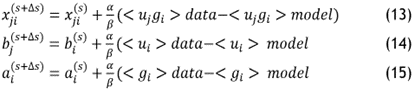 Where x is an RBM parameter, which includes the relation weight xji among the nodes in the 2 layers, the hidden layer bias ai, and the input layer bias bj.