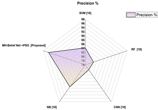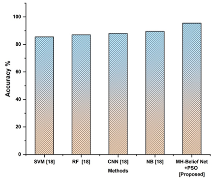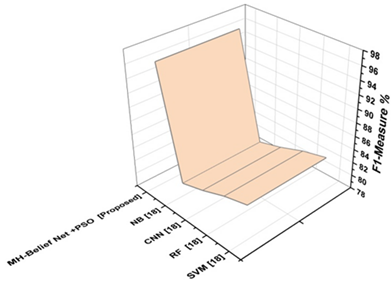Figure 6 and table 4, MH-Belief Net + PSO scored (96 %) on the f1-measure, followed by SVM (83,2 %), RF (82,3 %), CNN (81 %), and NB (80 %).
