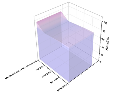 Table 3 and figure 5 present the recall measures’ comparisons. Recall values for SVM are 84,1 %, RF 83,6 %, CNN 82 %, NB 80,1 %, and MH-Belief Net + PSO 95,3 %.