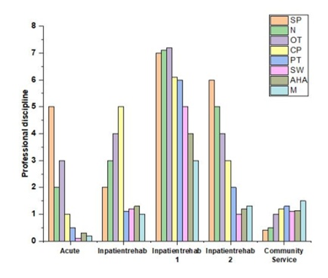 A study involving 65 healthcare workers, including 40 stroke specialists, examined the proportion of aphasia cases and professional discipline. The participants had varying experiences, with some not attending due to health-related or educational commitments, rotations, or illness. Table 1 contains specifics about the sites and users that are taking part. Figure 1 and 2 shows the proportion of aphasia caseload and Professional discipline.